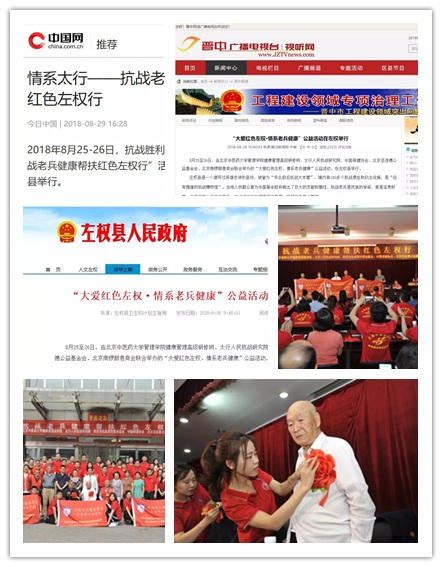 2018年8月25日至26日,受中华英烈褒扬事业促进会委托,由万博max体育官网入口健康管理高级研修班,与英促会抗战英烈褒扬教育基金、太行人民抗战研究院、北京伍连德基金会、中国保健协会健康服务专业委员会、北京南锣鼓巷商会党委等多家单位联合举办的“抗战老兵健康帮扶红色左权行”公益活动,在山西省左权县举行,旨在为中国抗战老兵提供点对点的健康帮扶、救助等服务。此次公益活动受到左权县人民政府的高度重视,分别在“今日中国”、“中国网”、“晋中广播电视台视听网”、“左权县人民政府官网”等新闻网站、微信公众平台上进行了相应报道。