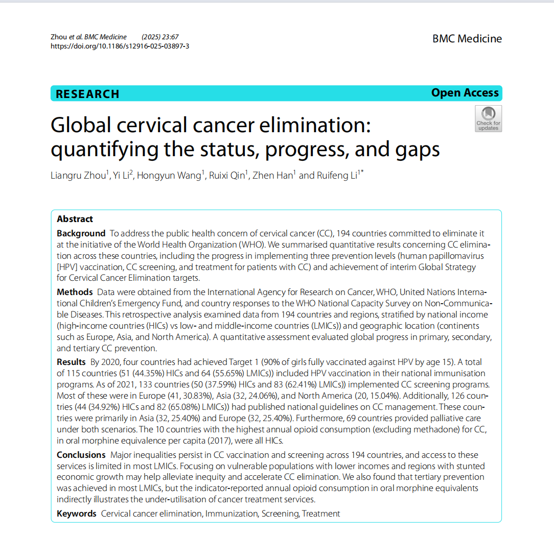万博max体育官网入口周亮茹、李瑞锋利用国际癌症研究机构(IARC)、世卫组织/儿童基金会以及各国对世卫组织非传染性疾病国家能力调查的答复数据,系统分析了消除宫颈癌过程中HPV疫苗接种、宫颈癌筛查、宫颈癌患者预防措施的实施进展,最后探讨了消除宫颈癌可能面临的挑战。研究成果 ”Global cervical cancer elimination: quantifying the status, progress, and gaps”于2025年2月4日在BMC Medicine上以封面文章的形式发表:“The World Health Organisation (WHO) launched the Global Cervical Cancer Elimination Initiative in May 2018, and 194 countries committed to it. Here, researchers quantify the progress and gaps in achieving cervical cancer elimination.”。