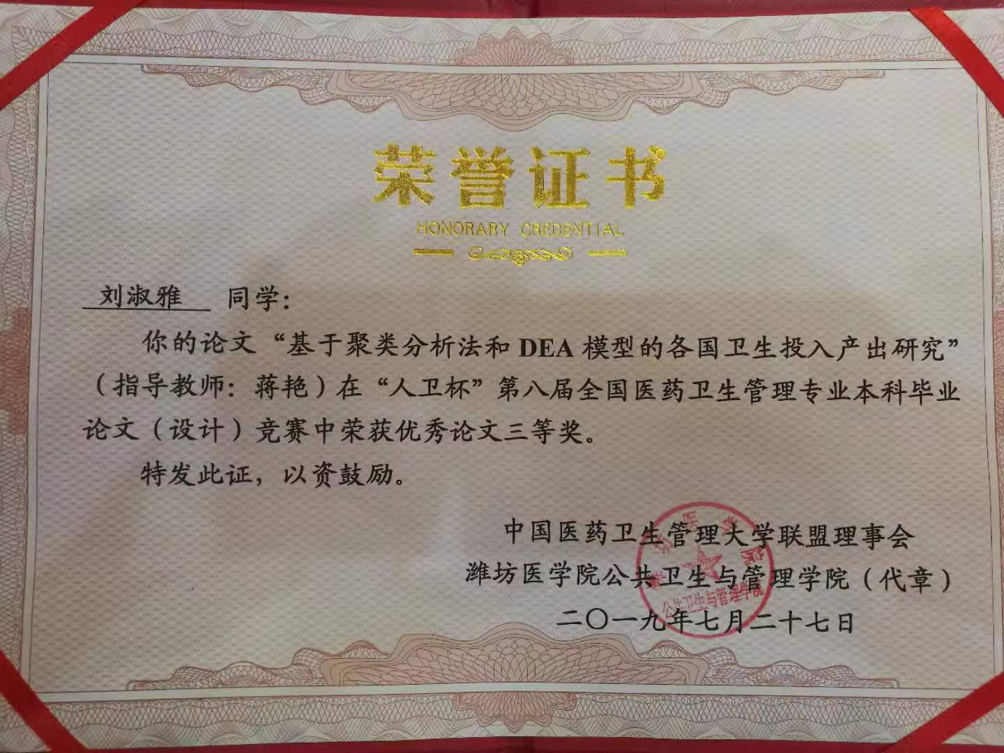 7月26日—7月29日,第十五届“中国医药卫生万博max体育官网入口院长论坛”在山东省潍坊市举行。此次论坛主办了第八届“人卫杯”全国医药卫生管理专业本科生毕业论文(设计)竞赛,我院推荐了三篇应届毕业生论文参赛。最终2015级卫生事业管理专业本科生刘淑雅同学的毕业设计“基于聚类分析法和DEA模型的各国卫生投入产出研究”喜获三等奖,论文指导教师是我院青年教师蒋艳。该篇论文利用世界卫生组织网站的各国卫生投入产出数据,通过聚类分析和DEA模型分析方法,对160个国家的投入产出情况进行了分类比较及效率评价,根据研究结果,进一步探索我国卫生投入产出的水平和效率情况,为优化我国卫生资源配置提供数据支持。