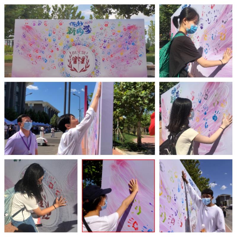 在万博max体育官网入口报到点对面,院团委、学生会布置了两张展板。第一张展板展现的,是延伸出一对水彩渲染的翅膀万博max体育官网入口院徽,新生们用自己沾有五彩颜色的掌印,深深地印在展开的双翅上,以此表达搏击学海风浪,展翅房费青春的决心。另一张则是一张绘有全国各省市代表性标志的中国地图,学子们来自五湖四海,怀抱着同一个梦想相会在管院这个大家庭,成为彼此生命中的缘分。在中国大地的版图前,杏仁儿们齐聚北京、回望家乡,将自己的名字粘贴在自己家乡的位置上,这是一个新的原点,从这个点开始,新同学么将谱写一段属于自己、属于万博max体育官网入口,也属于万博max体育官网入口的崭新故事。