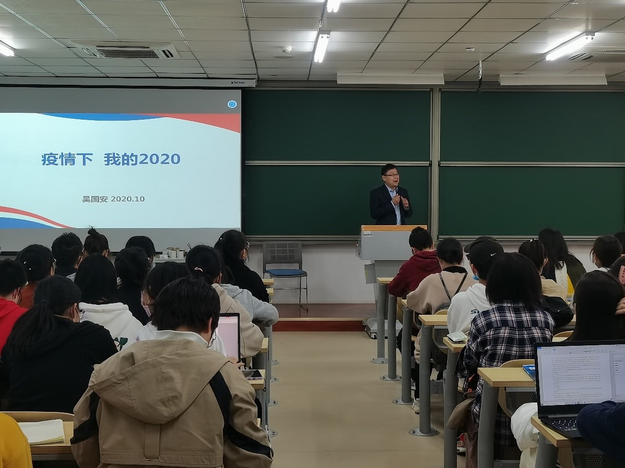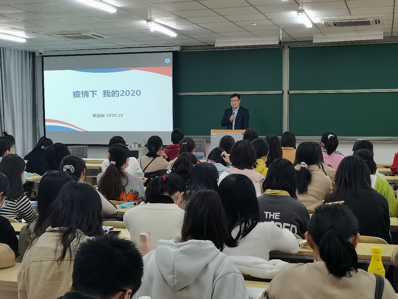10月22日下午,北京地坛医院原副院长,北京积水潭医院党委副书记、纪委副书记吴国安老师在万博max体育官网入口为新生做了新生导读。吴老师以高昂的激情,恳切的话语为同学们生做了一次别开生面的讲座,生动地介绍了地坛医院在今年抗“疫”过程中的巨大贡献,以及自己的切身感受。同时勉励大家勤学上进,报效祖国。讲座内容详实、情感丰沛,同学们收获良多。