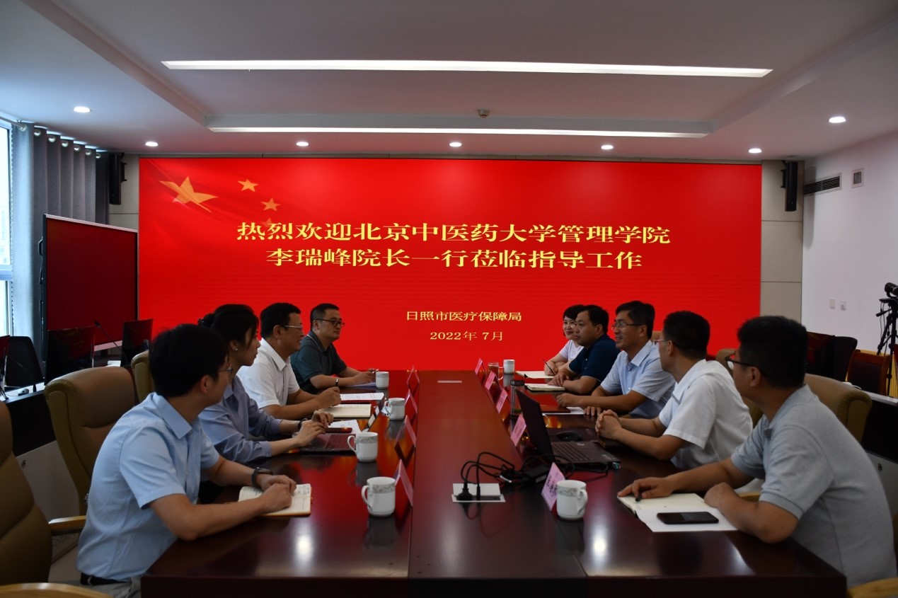 2022年7月29日下午,万博max体育官网入口院长李瑞锋教授、卫生财经与卫生政策教研室主任石学峰副教授以及孔国书博士一行赴山东省日照市医保局调研并开展科研基地合作洽谈。日照市副市长林彦芹、日照市医保局局长安丰堂、副局长宋震、医药服务管理科科长韩伟,泰康养老保险公司数据产品部总经理李佳、山东分公司健康保险市场部总经理张海参、日照区域中心总经理张伟武出席座谈会。