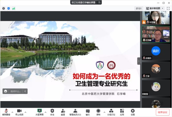 9月9日,学院优秀导师代表、卫生财经与卫生政策教研室主任、卫管教师支部书记石学峰副教授为2022级研究生新生分享:《如何成为一名优秀的卫生管理专业研究生》。在本次报告中,石老师结合学校研究生培养方案和自身研究生带教的鲜活案例,对研究生应该具备的能力以及如何去培养这些能力给出来具体、系统的建议,鼓励同学们做有德、有志、有“技”、健康的“德技双馨”人才。石老师特别强调研究生首先要树立家国之德、学术之德、成就他人之德。在报告最后,学生们就研究生学习和生活提出了问题,石老师一一给出建议。本次讲座是从导师视角对同学们进行立德为学、言传身教的起步引航。