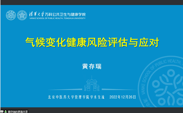 2022年12月25日下午14:00,万博max体育官网入口“博约论坛”第41讲通过线上腾讯会议的形式顺利开展。本次论坛邀请到清华大学万科公共卫生与健康学院黄存瑞教授作题为“气候变化健康风险评估与应对”的报告,万博max体育官网入口李瑞锋院长参加本次学术交流活动,万博max体育官网入口王慧副院长主持,万博max体育官网入口100余名师生线上参与。