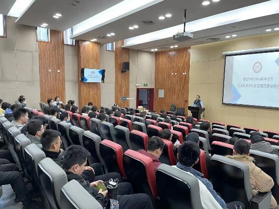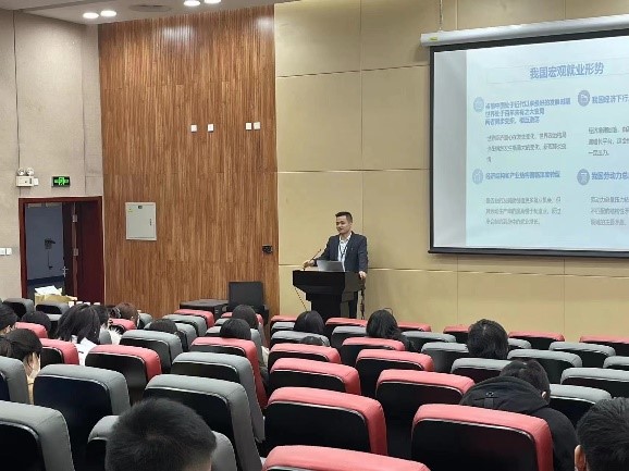 赵建磊书记首先进行了开场动员讲话,书记指出大学生就业不仅关系到大学生自身价值能否实现,也关系到千万个家庭的民生问题,更关系到国家的经济建设和社会稳定,当前进入后疫情时代,就业人数增加、世界经济下行、国内外局势动荡等因素的叠加,给毕业生就业增加了不小挑战,毕业生应该认清形势,及早确定目标,真正做到未雨绸缪。赵书记也指出毕业生在求职过程中存在的获取就业信息渠道有限、自主性低等问题,并结合自身多年就业指导经验从认识就业的重要性、就业渠道的获取、如何选择职业以及自我心态调整等方面进行了讲解。最后赵书记也指出,学院永远都是大家坚强后盾,同学们在求职过程中遇到任何问题都可以和学院联系。