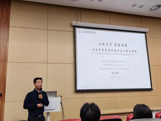 9月10日下午,学院特别邀请全国医学教育发展中心吴红斌副研究员带来了《心怀天下 洁静精微》讲座。吴老师从研究生与自我、与导师、与父母、与同伴、与AI等多维度关系出发,引领研究生不断完善自我、深化沟通艺术、提升人生境界,鼓励学生们从大处着眼,树立宏伟志向,从小处入手,追求精益求精。整场讲座内容丰富、观点鲜明,让在场的师生都受益匪浅。随后,青年教师科研之路分享活动,石泽华老师以自己的多学科求学经历,鼓励研究生直面当下,重视专业学习,缓解焦虑。